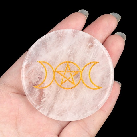 Símbolos de Luna y estrella de triple diosa grabados de Color dorado de 55mm, losa redonda de cuarzo transparente, discos de piedra de energía de cristal curativo Reiki