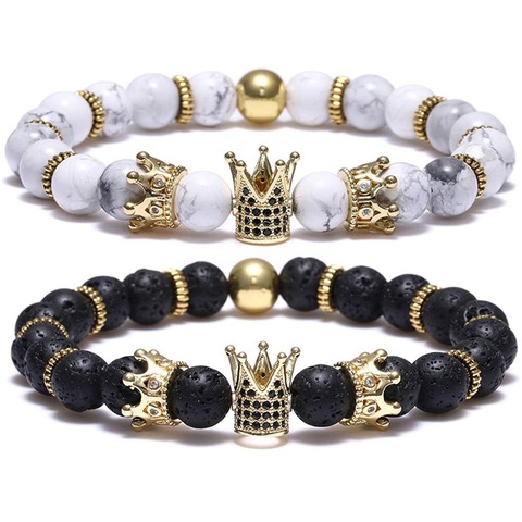 Groothandel Custom Make Sieraden Mannen Matte Kraal Armband Lava Steen Wit Turquoise Koper Diamant Kroon Armband